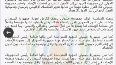 جيبوتي ترحب بعودة السودان لمنظمة الإيقاد