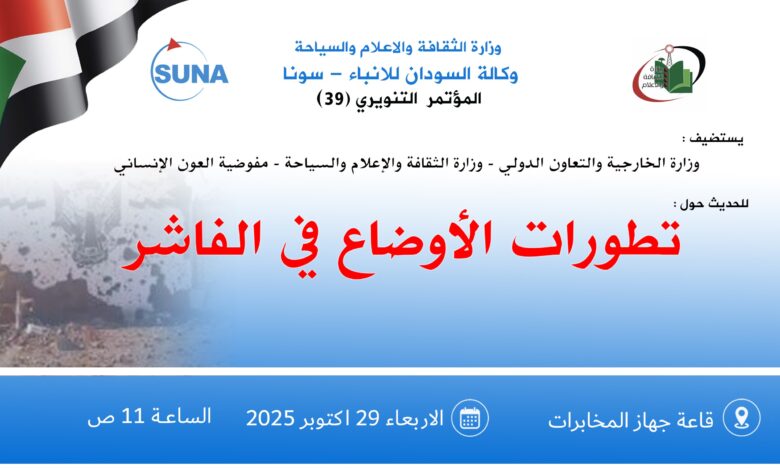 تنظم وزارة الثقافة والإعلام، عبر وكالة السودان للأنباء (سونا)، المؤتمر التنويري رقم (39) في تمام الساعة الحادية عشرة من صباح غدٍ الأربعاء الموافق 29 أكتوبر 2025م، وذلك بقاعة المخابرات ببورتسودان.