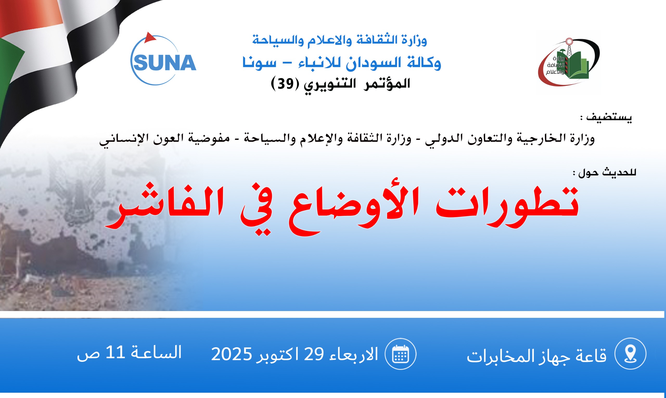 تنظم وزارة الثقافة والإعلام، عبر وكالة السودان للأنباء (سونا)، المؤتمر التنويري رقم (39) في تمام الساعة الحادية عشرة من صباح غدٍ الأربعاء الموافق 29 أكتوبر 2025م، وذلك بقاعة المخابرات ببورتسودان.