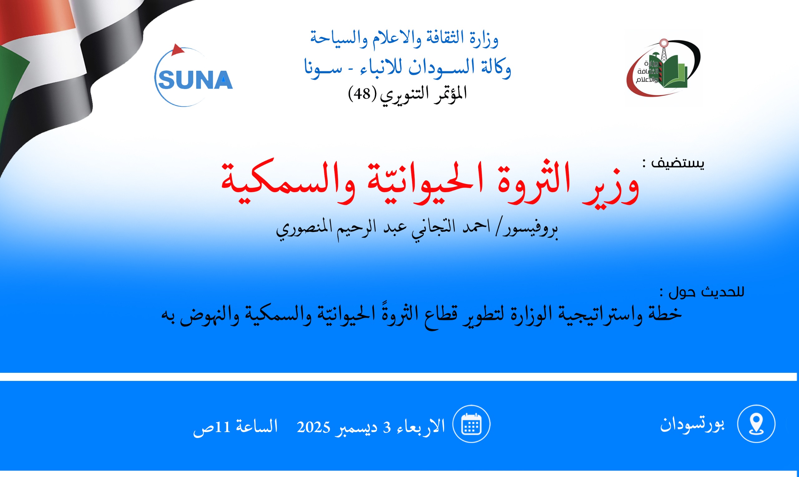 يستضيف المؤتمر التنويري رقم 48 لوزارة الثقافة والإعلام والسياحة الذي تنظمه وكالة السودان للأنباء في الحادية عشرة من صباح غد الخميس وزير الثروة الحيوانيّة والسمكية البروفيسور احمد التجاني عبد الرحيم المنصوري.