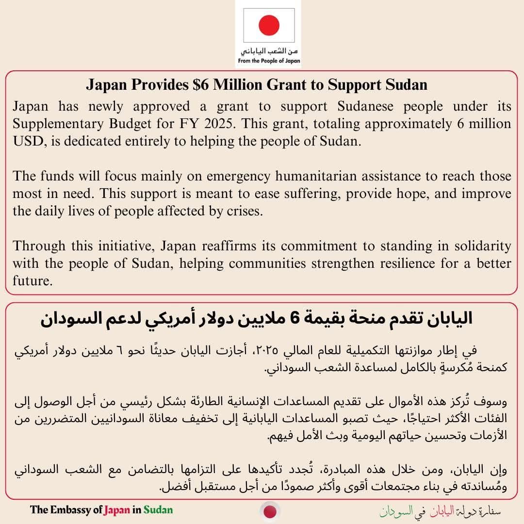 قررت الحكومة اليابانية تقديم منحة إنسانية لجمهورية السودان بقيمة ستة ملايين دولار، وذلك في إطار دعمها المستمر والمتواصل للشعب السوداني، لمساندة المتأثرين بالحرب من النازحين وتخفيف الأوضاع الإنسانية المتدهورة.