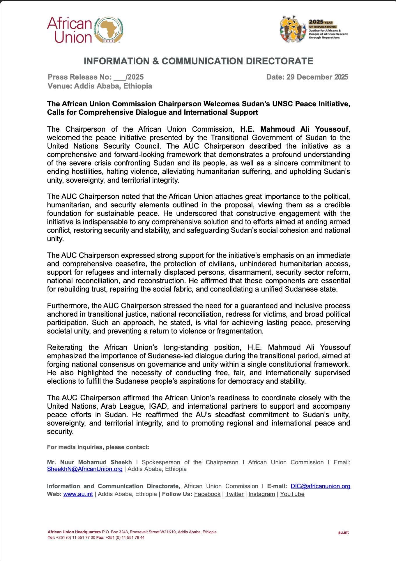 وأعرب رئيس مفوضية الاتحاد الأفريقي عن دعمه القوي للمبادرة ، مؤكدا التزام الاتحاد الأفريقي الراسخ بوحدة السودان وسيادته وسلامته الإقليمية، وبتعزيز السلام والأمن الإقليميين والدوليين.