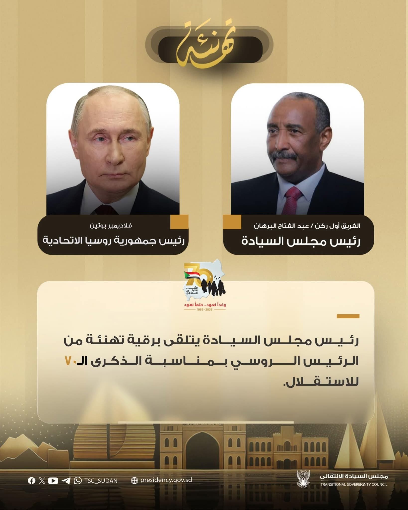 تلقى رئيس مجلس السيادة الانتقالي، الفريق أول ركن عبد الفتاح البرهان، برقيات تهنئة بمناسبة الذكرى المجيدة لاستقلال السودان، من عددٍ من رؤساء الدول والملوك.