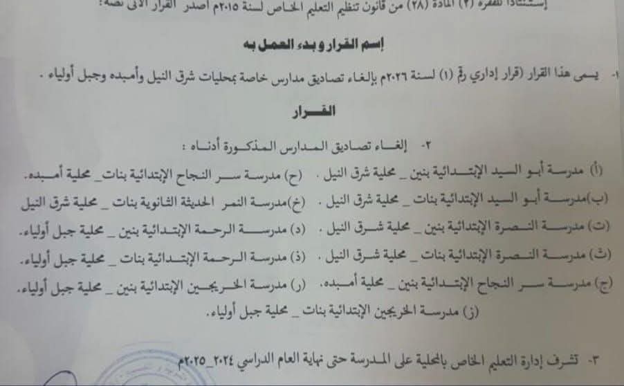 وشمل القرار مدارس أبو السيد الابتدائية بنين وبنات بمحلية شرق النيل، ومدارس النصرة الابتدائية بنين وبنات بالمحلية ذاتها، إلى جانب مدرسة النمر الحديثة الثانوية بنات، ضمن مدارس أخرى شملها الإلغاء.