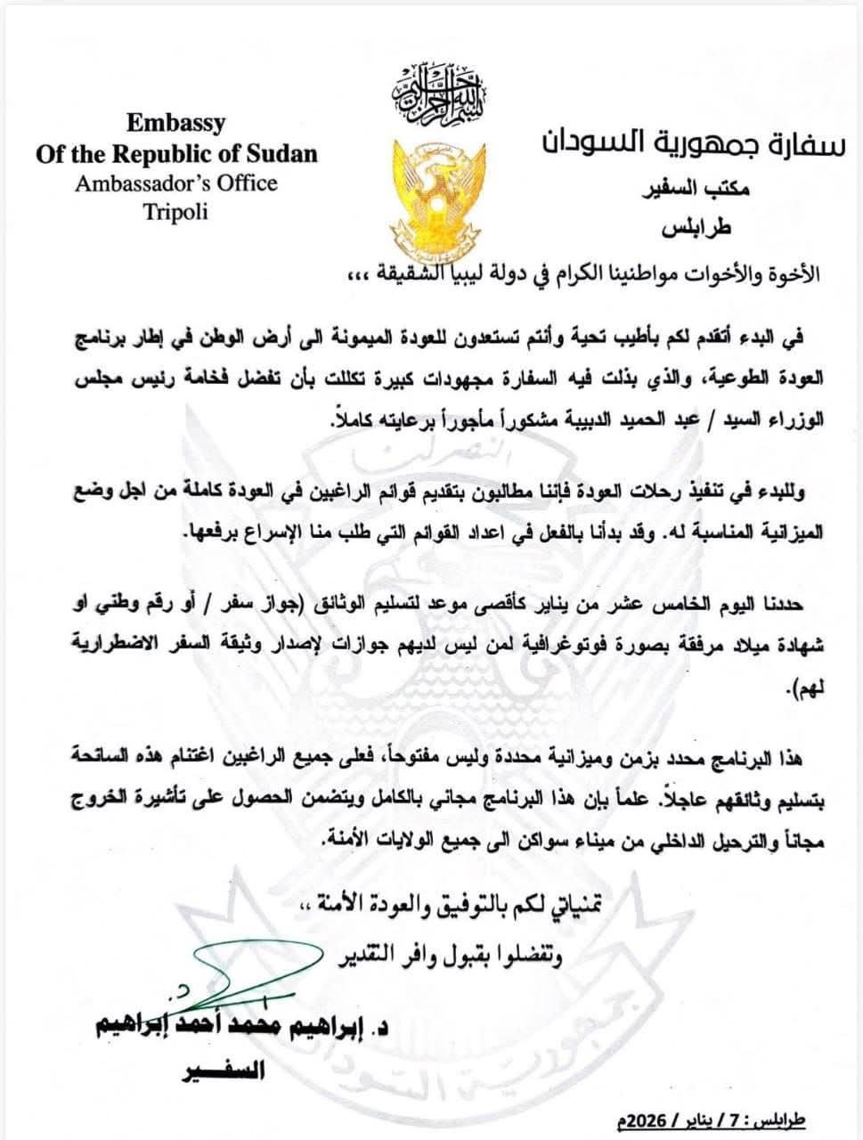 السفارة السودانية بطرابلس تحدد آخر موعد للتقديم للعودة الطوعية المجانية
