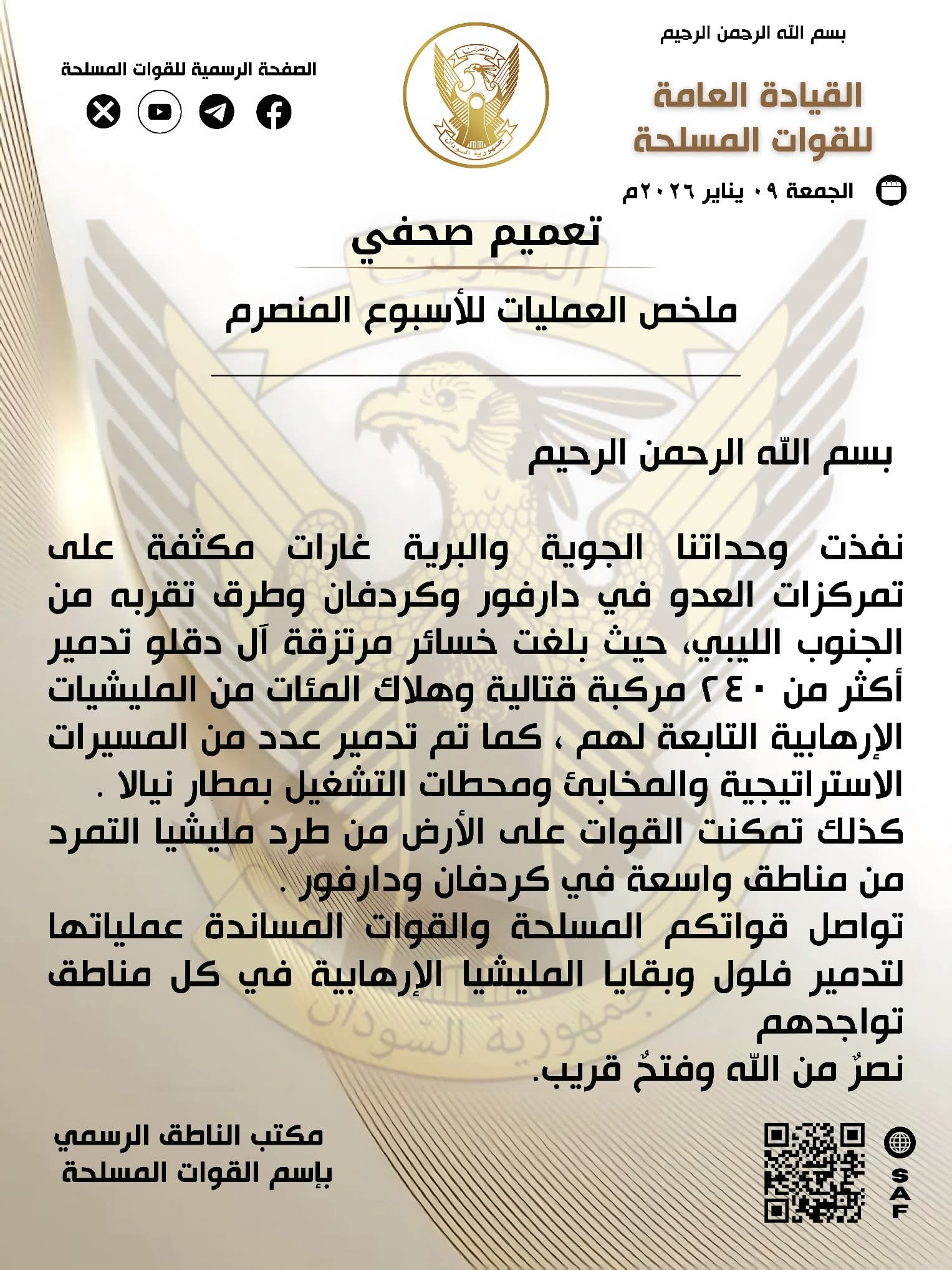 نفذت وحداتنا الجوية والبرية غاراتٍ مكثفةٍ على تمركزات العدو في دارفور وكردفان وطرق تقربه من الجنوبِ الليبي، حيث بلغت خسائر مرتزقة آل دقلو تدمير أكثر من ٢٤٠ مركبةٍ قتاليةٍ وهلاك المئات من المليشياتِ الإرهابيةِ التابعة لهم ، كما تم تدمير عدد من المسيراتِ الاستراتيجية والمخابئ ومحطات التشغيل بمطار نيالا ، كذلك تمكنت القواتُ على الأرض من طردِ مليشيا التمرد من مناطق واسعة في كردفان ودارفور .