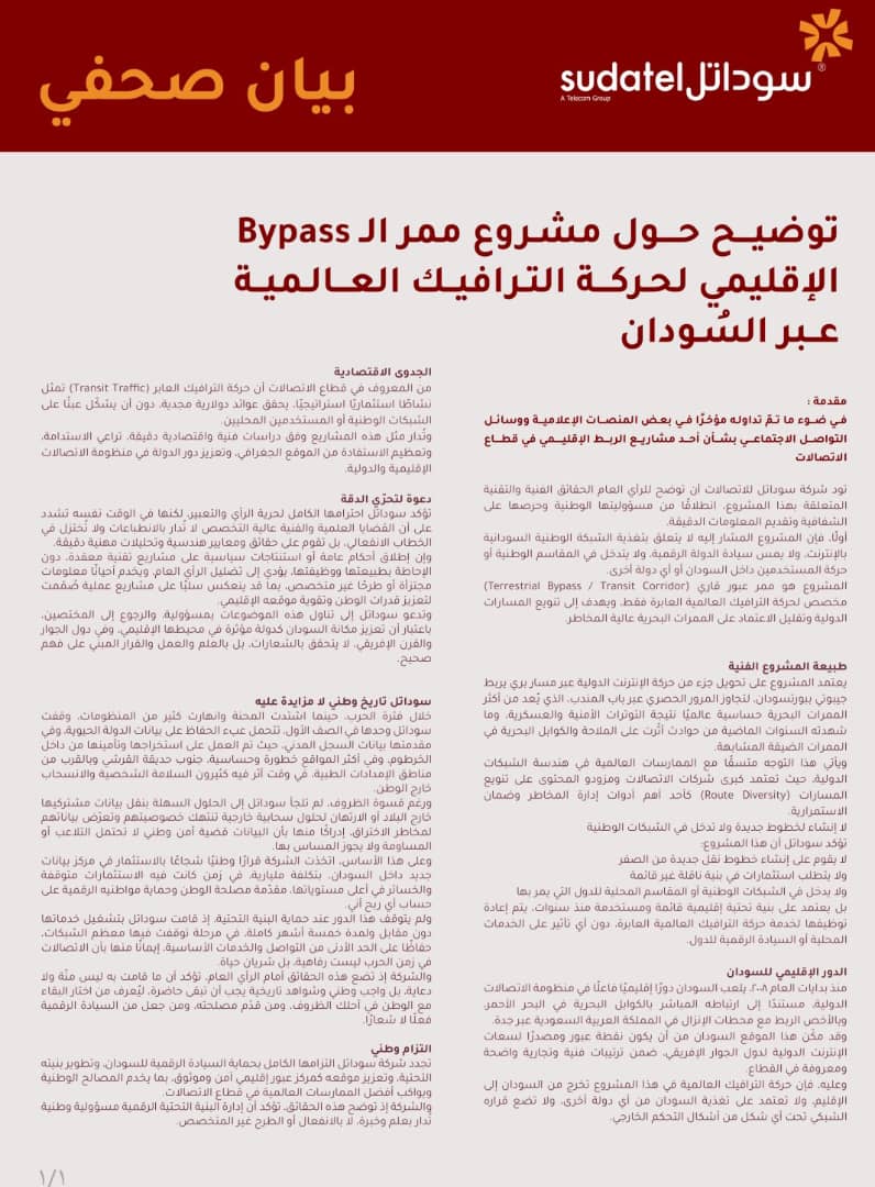 أصدرت سوداتل بيانا صحفيا حول حول مشروع ممر Baypass الإقليمي لحركة الترافيـك العالمية عبر السودان ، وأكدت التزامها الكامل بحماية السيادة الرقمية للسودان، وتطوير بنيته التحتية، وتعزيز موقعه كمركز عبور إقليمي آمن وموثوق بما يخدم المصالح الوطنية ويواكب أفضل الممارسات العالمية في قطاع الاتصالات .