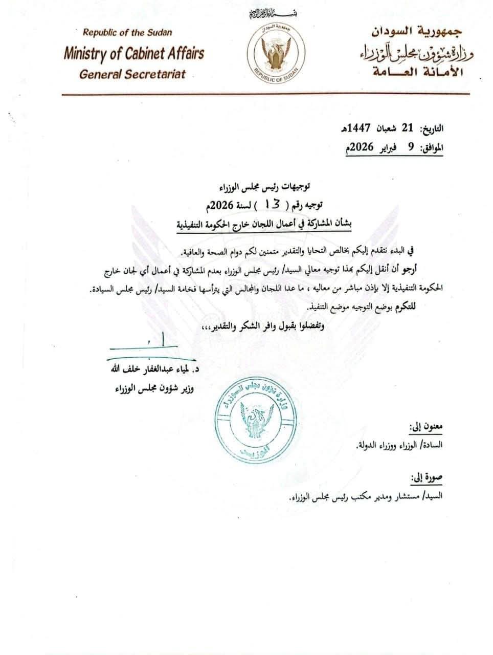أصدر رئيس مجلس الوزراء، كامل إدريس، توجيهاً يقضي بمنع الوزراء من المشاركة في أي لجان أو أجسام خارج نطاق الجهاز التنفيذي، إلا بعد الحصول على إذن مسبق من رئيس المجلس.