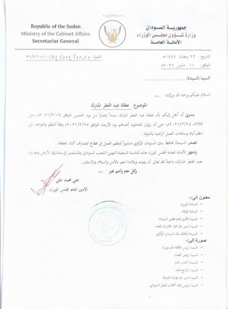 أعلن مجلس الوزراء أن عطلة عيد الفطر المبارك للعاملين في الدولة ستبدأ يوم الخميس الموافق 19 مارس، وتستمر حتى يوم الثلاثاء 24 مارس 2026.