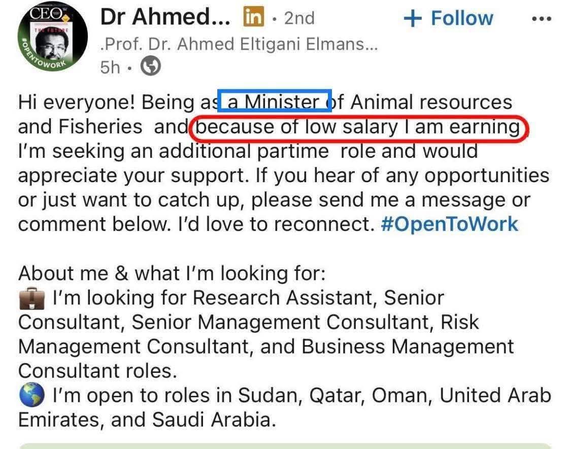 في لحظة.. يقتسم فيها السودانيون اللقمة والوجع، ويقف فيها الرجال في خنادق القتال لشهور بلا رواتب؛ يخرج علينا وزير الثروة الحيوانية والسمكية ، البروفيسور المنصوري، بمنشور على موقع “لينكد إن” يثير الكثير من التساؤلات الأخلاقية والسياسية.