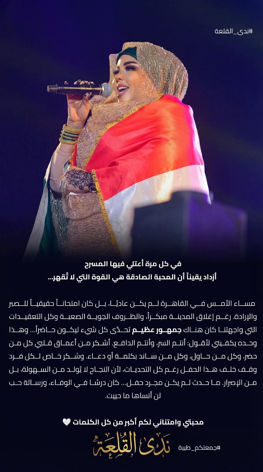 في تصريحات خاصة لها  قالت الفنانة ندى القلعة: “في كل مرة أعتلي فيها المسرح، أزداد يقينًا أن المحبة الصادقة هي القوة التي لا تُقهر… وأنتم السر، وأنتم الدافع.”