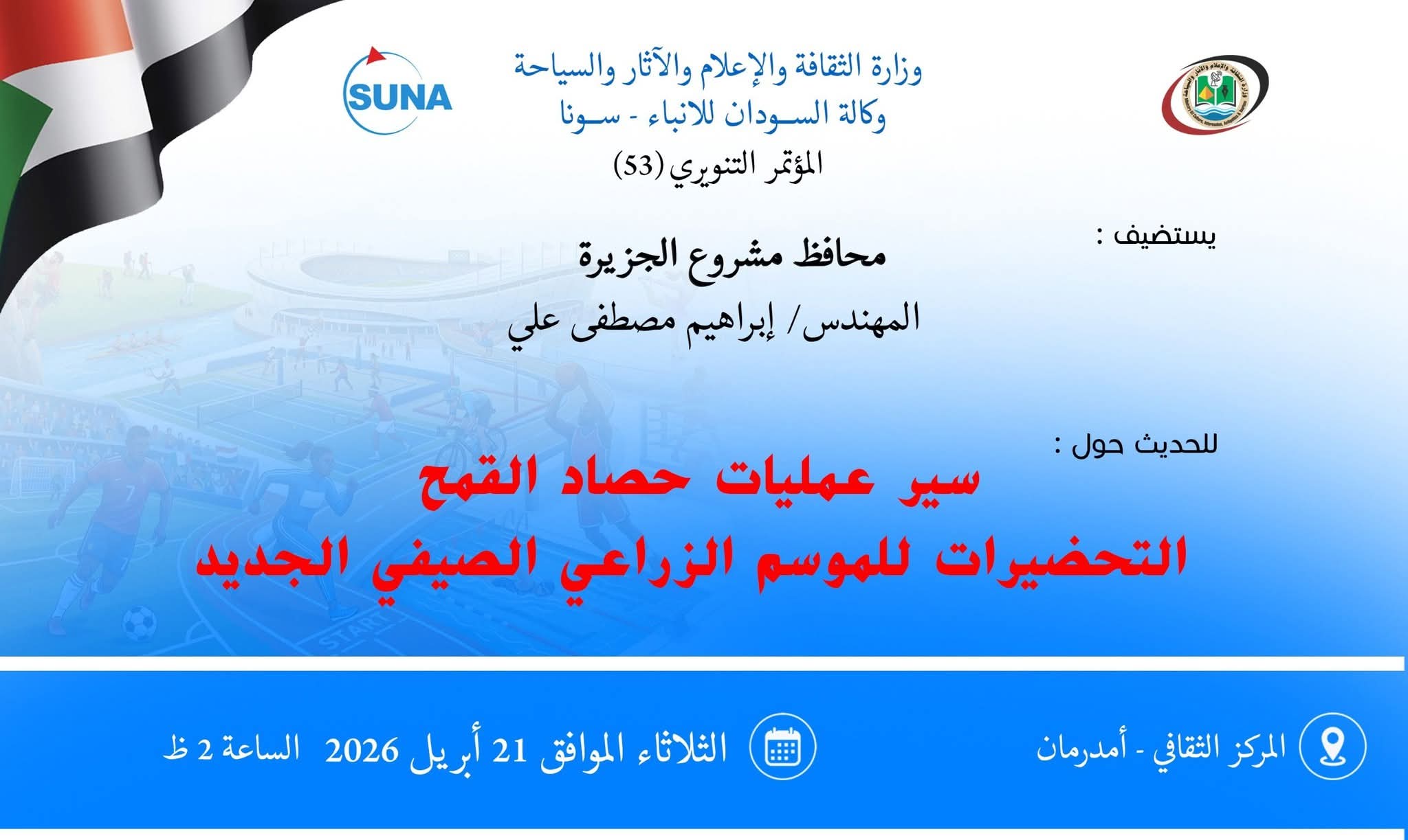 يستضيف المؤتمر التنويري رقم (53) لوزارة الثقافة والإعلام والآثار والسياحة، الذي تنظمه وكالة السودان للأنباء “سونا”، في تمام الساعة الثانية من ظهر غدٍ الثلاثاء الموافق 21 أبريل 2026م، محافظ مشروع الجزيرة الزراعي المهندس إبراهيم مصطفى علي.
