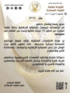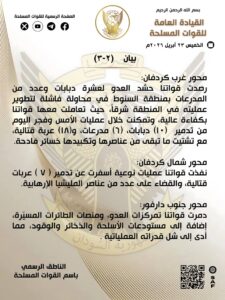 تواصل قواتكم المسلحة و القوات المساندة، أداء واجبها الوطني بثبات ، محققةً خلال الـ(٧٢) ساعة الماضية سلسلة من الضربات النوعية القاصمة لمليشيا آل دقلو الإرهابية ومرتزقتها في مختلف المحاور، جاءت نتائجها على النحو التالي: