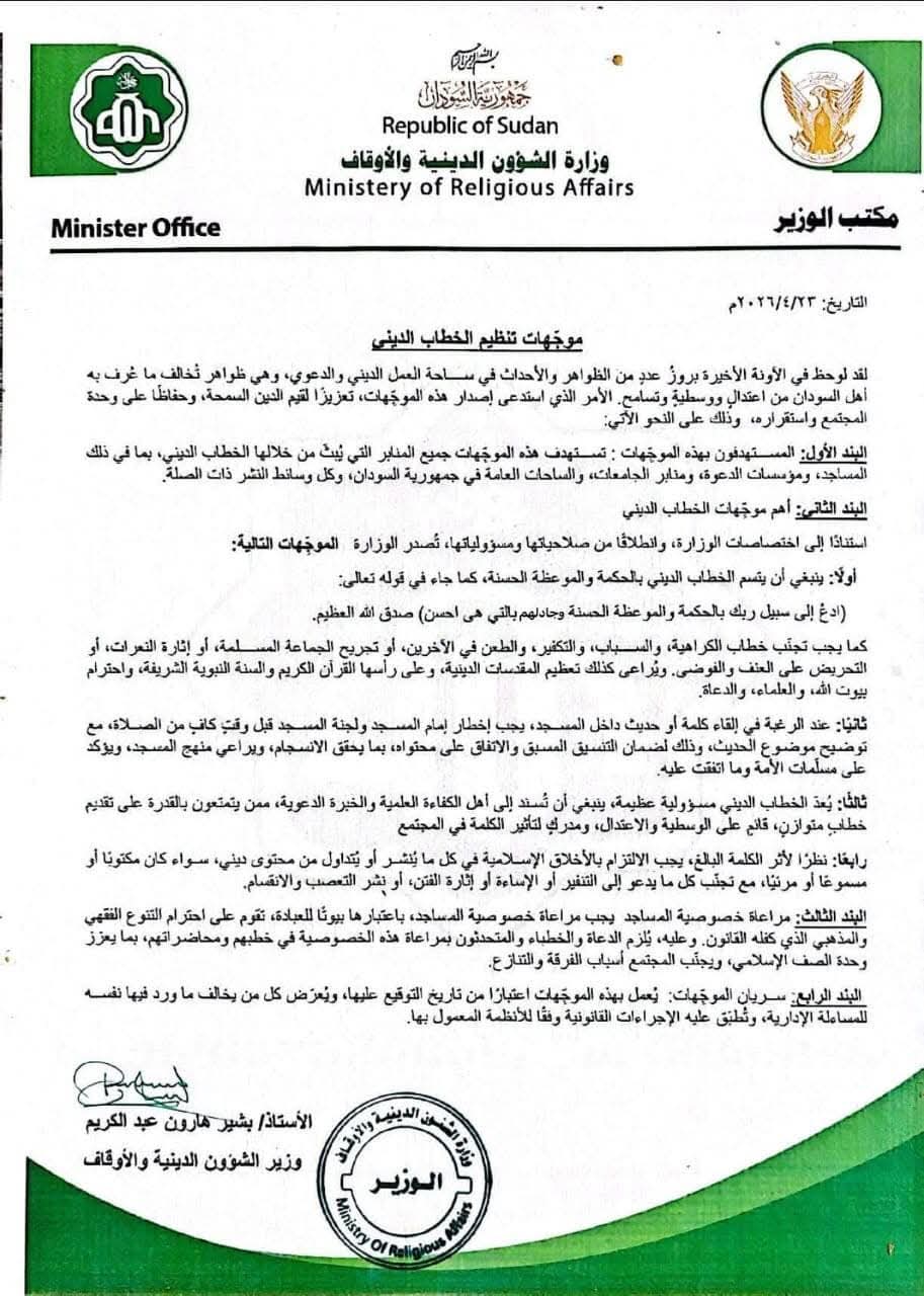 ووقّع على الموجِّهات وزير الشؤون الدينية والأوقاف، بشير هارون عبد الكريم، يوم الخميس الموافق 23 أبريل 2026.
