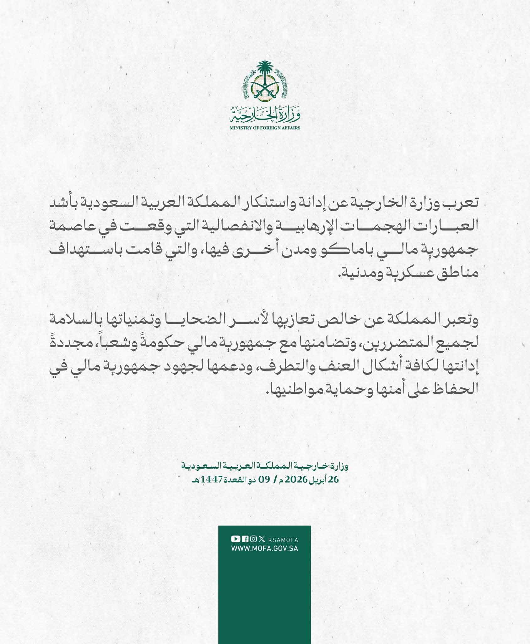 أعربت وزارة الخارجية السعودية عن إدانة واستنكار المملكة العربية السعودية بأشد العبارات للهجمات الإرهابية والانفصالية التي وقعت في العاصمة المالية باماكو وعدد من المدن الأخرى، والتي استهدفت مواقع عسكرية ومدنية.