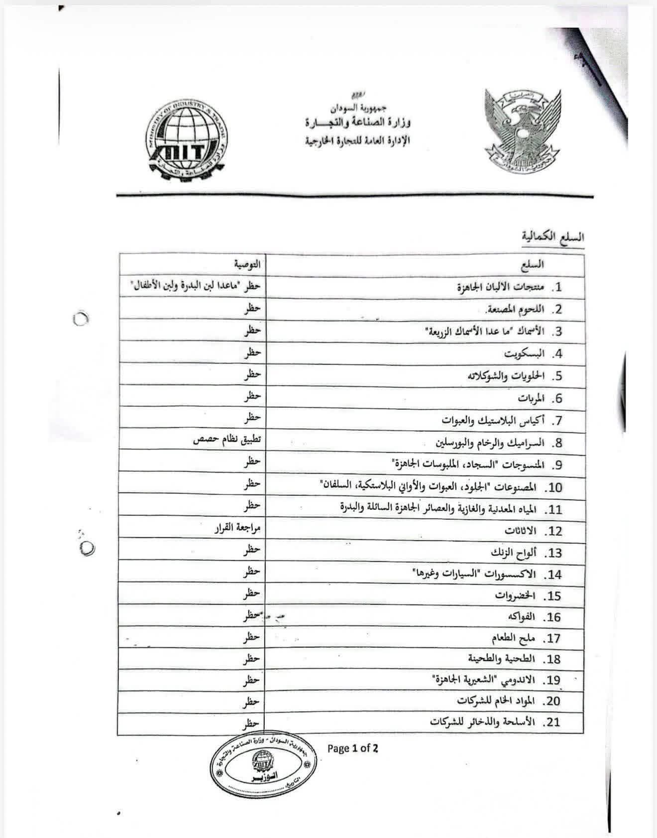 وأوضحت الوثيقة أن القرار يتضمن استثناءات محددة، من بينها السماح باستيراد ألبان الأطفال وبعض المنتجات الضرورية، إلى جانب إخضاع بعض السلع لنظام الحصص أو المراجعة المستقبلية وفقاً للمتغيرات الاقتصادية.