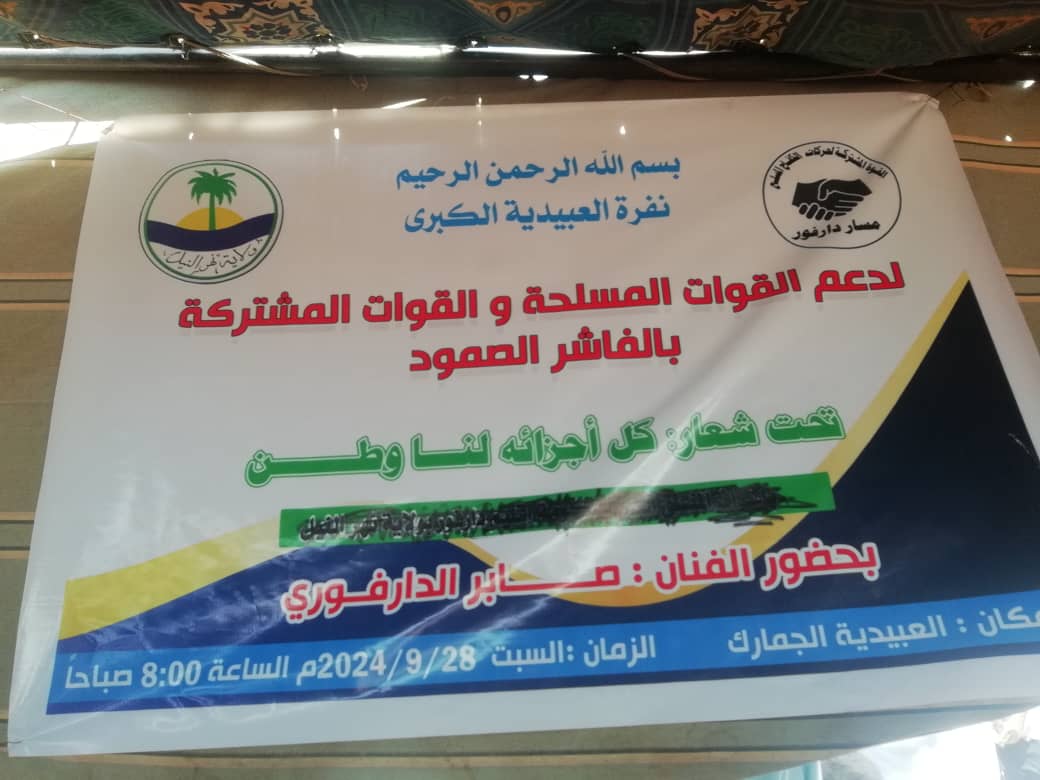 شهدت منطقة العبيدية بولاية نهر النيل تدشين النفرة الكبري لدعم القوات المسلحة والقوات المشتركة بالفاشر تقديرا لصمود اهلها وبسالتهم والوقفة الصلبة لرجالها ونسائها ومنعهم لسقوطها في ايدي المتمردين واكد المنسق العام لحكومة اقليم دارفور بولاية نهر النيل معتصم يوسف كمبو ان حرب الكرامة وحدت السودانيين وازالة الفوارق الاجتماعية التي نتجت في الفترة السابقة واشار الي أن الشعب السوداني وقواته تعهدوا بدحر الجنجويد و القضاء علي آخر متمرد واوضح كمبو ان الوفد المرافق له يضم لجنة الاسناد والمقاومة الشعبية بالفاشر الزائر لولاية نهر النيل لايصال رسائل بان السودان تعرض لخطر كبير واستهداف واضح بهذه الحرب وليس بهدف الدعم والاسناد باعتبار انها ساهمت في تجهيز مجموعة من المستنفرين والمقاومة الشعبية تقاتل الان في الصفوف الامامية بالفاشر واشاد منسق عام حكومة اقليم دارفور بمواطن ولاية نهر النيل للتعايش السلمي والنسيج الاجتماعي المترابط مع ابناء دارفور كما اشاد باهل منطقة العبيدية لمواصلة نفراتهم الداعمة للقوات المسلحة والمشتركة بجميع محاور القتال واصفا هذه القافلة بالنوعية لتخصيصها للفاشر مما يؤكد شعار كل اجزائه لنا وطن.
