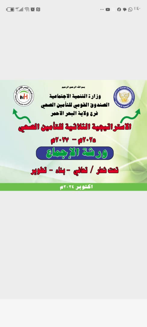 تبدأ يوم غد (الخميس) الورش التحضيرية للتأمين الصحي في جميع الولايات للاعداد لخطة عمل الصندوق الاستراتيجية الثلاثية للاعوام ٢٠٢٥_٢٠٢٦_٢٠٢٧م تحت شعار (تعافي، بناء، تطوير) .