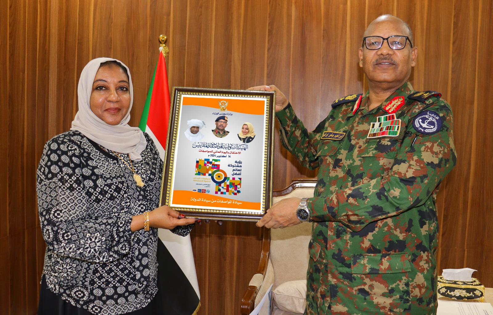 هنأ عضو مجلس السيادة الإنتقالي الفريق أول مهندس بحري مستشار ابراهيم جابر الهيئة السودانية للمواصفات والمقاييس بمناسبة اليوم العالمي للمواصفات الذي يصادف الرابع عشر من شهر أكتوبر من كل عام مثمنا لدي استقباله بمكتبه الاستاذه رحبه سعيد عبد الله المدير العام للهيئه والوفد المرافق لها الدور الكبير الذي تقوم به في حماية المستهلك والاقتصاد الوطني رغما عن ظروف الحرب وقيامها بأدوارها الرقابية على الواردات والإنتاج المحلي وترقية الصادرات مشيدا في هذا الصدد بالاستجابة السريعة للهيئه في تنفيذ موجهات مجلس السيادة بتجهيز وإكمال مشروع النافذة الموحدة لصادر الذهب كأول تجربة من نوعها في طريق توحيد وتبسيط الإجراءات؛
