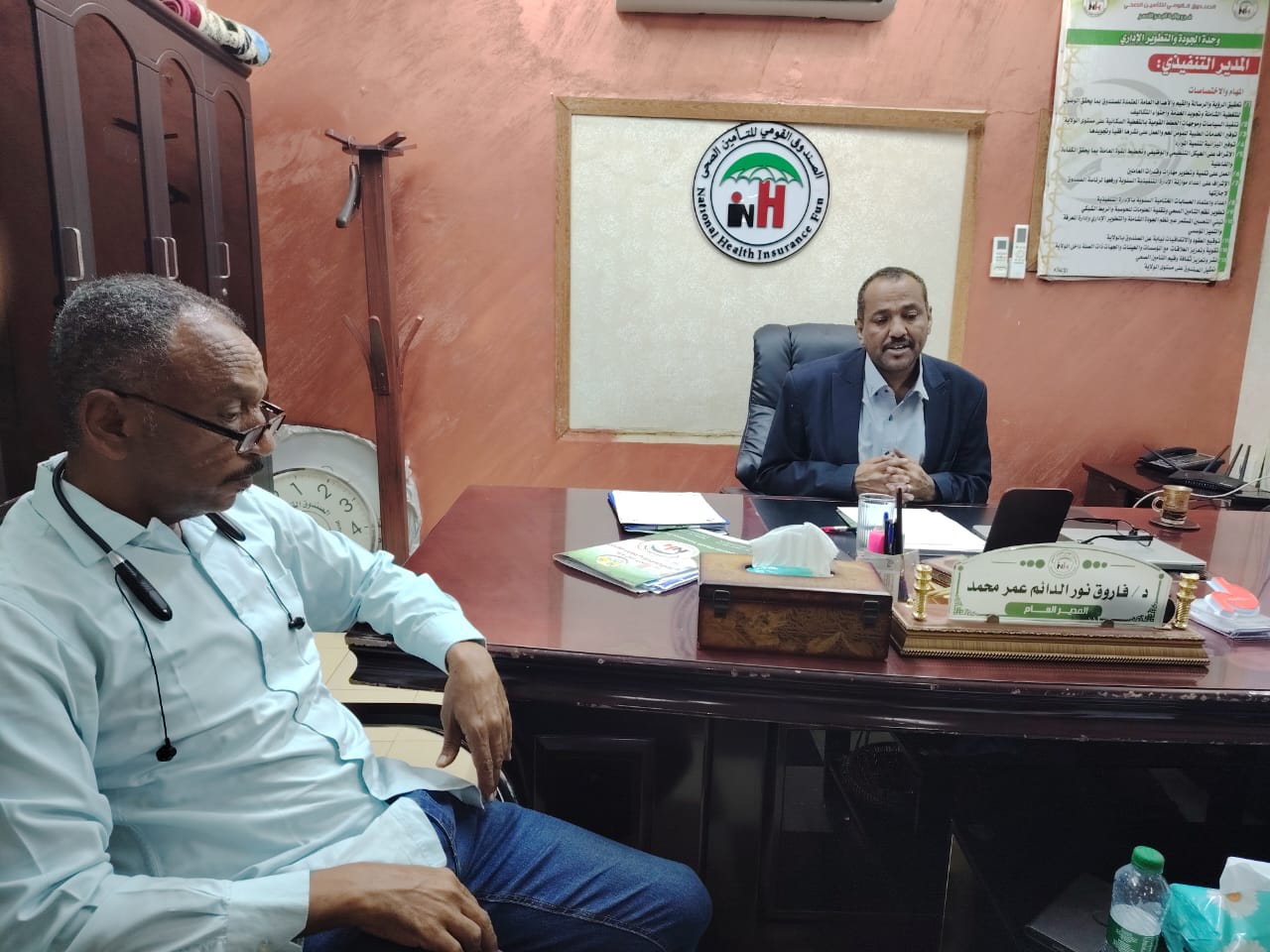 استهل مدير فرع الصندوق القومي للتأمين الصحي بولاية الجزيرة الدكتور الأمين حسين مهامه باجتماع ضمه الي المدير العام للصندوق القومي للتأمين الصحي الدكتور فاروق نورالدائم عقب إكمال إجراءات التسليم والتسلم.
