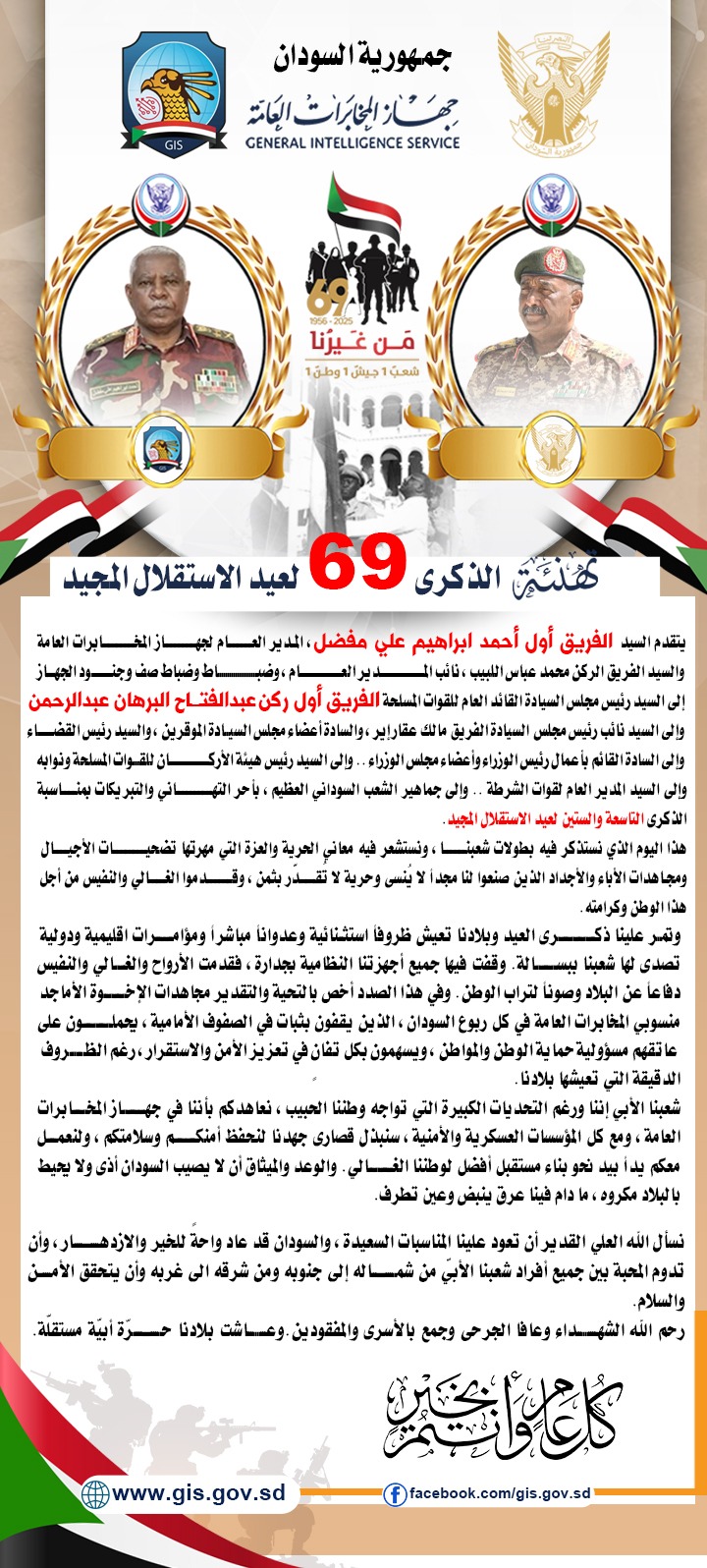 وإلى جماهير الشعب السوداني العظيم، بأحر التهاني والتبريكات بمناسبة الذكرى التاسعة والستين لعيد الاستقلال المجيد.