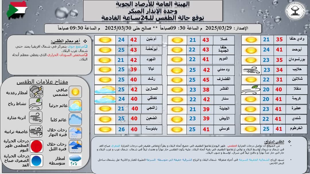 توقعت الهيئة العامة للأرصاد الجوية تواصل إرتفاع درجة الحرارة العظمي ظهر اليوم إرتفاعا طفيف في جميع أنحاء البلاد و يطرأ إنخفاض طفيف في درجات الحرارة الصغري صباح الغد في شمال و شمال أواسط البلاد و توالي إرتفاعها الطفيف في بقية أنحاء البلاد، عليه يكون الطقس حار نهاراً و معتدل ليلاً في شمال، شمال غرب و غرب البلاد و حار الي حار جداً نهاراً و دافئ ليلاً في شرق، اواسط و جنوب البلاد.