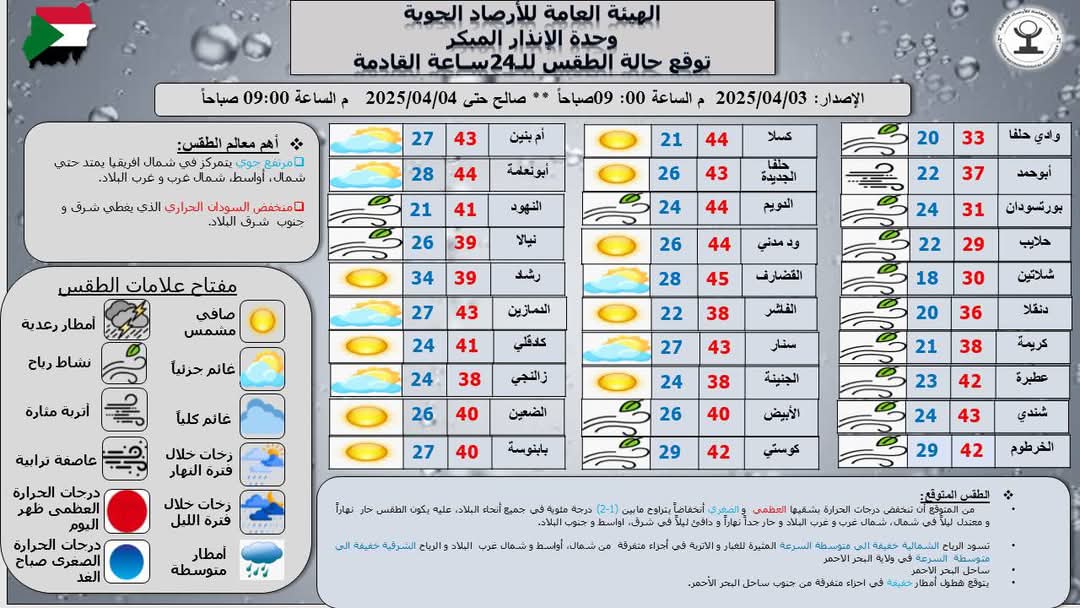 اعلي درجة حرارة متوقعة ظهراليوم 45.0ºم في كل من عطبرة، شندى، حلفا الجديدة، القضارف و ابي نعامة وأدني درجة حرارة متوقعة صباح الغد18.0 º م في مدينة شلاتين.