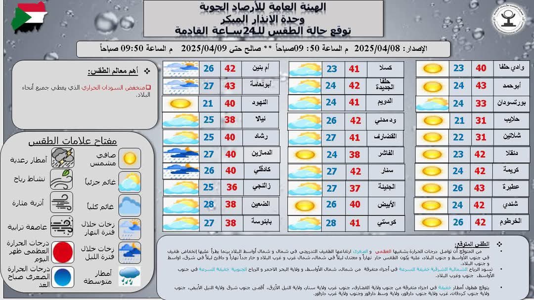 أعلى درجة حرارة متوقعة ظهراليوم 44.0ºم في كل من أبوحمد، عطبرة و ابي نعامة وأدنى درجة حرارة متوقعة صباح الغد21.0 º م في كل من حلايب و النهود.
