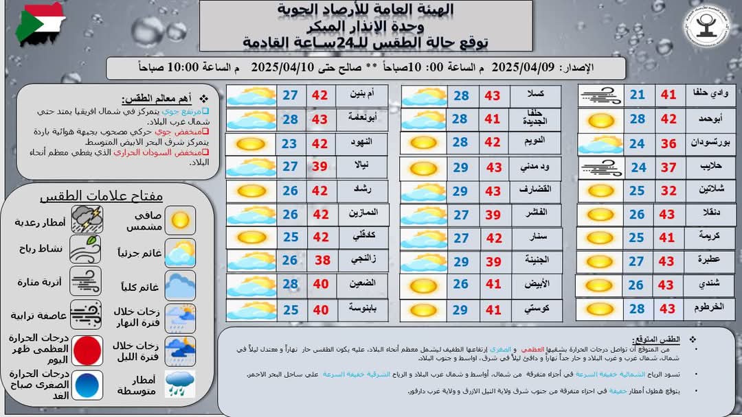 أعلى درجة حرارة أمس: 43.0°م في شندي