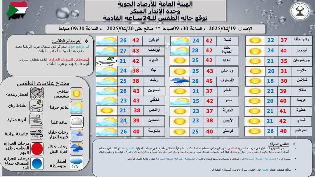 أعلى درجة حرارة متوقعة ظهر اليوم 45.0م في مدينة القضارف وأدنى درجة حرارة متوقعة صباحالغد 18.0 ” م في مدينة شلاتين .