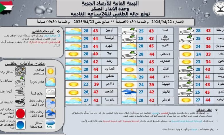 أعلى درجة حرارة سجلت ليوم أمس كانت 44.8م في مدينة شندي و ادناها صباح اليوم 22.5 م في مدينة