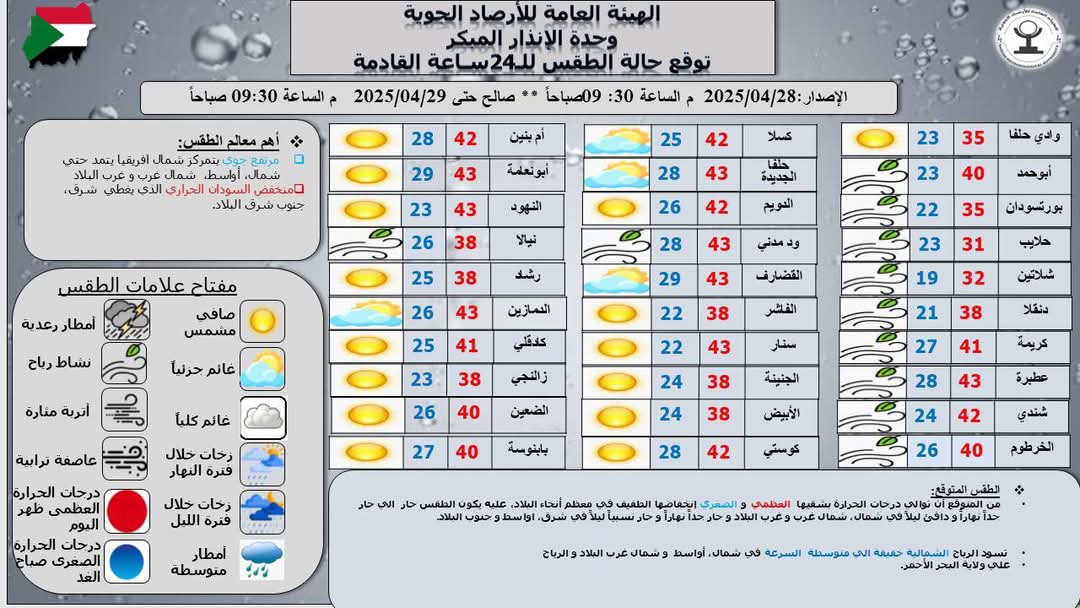 أعلى درجة حرارة سجلت ليوم أمس كانت 43.5 في مدينة عطبرة و ادناها صباح اليوم 20.9 م في مدينة