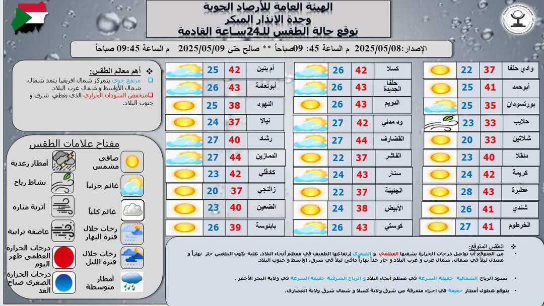من أهم معالم الطقس خلال ال24ساعه القادمة وفق ما جاء فى نشرة الهيئة اليوم مرتفع جوي يتمركز في شمال افريقيا يغطي شمال، شمال الأواسط و شمال غرب البلاد , منخفض السودان الحرارى الذي يغطي شرق وجنوب البلاد .