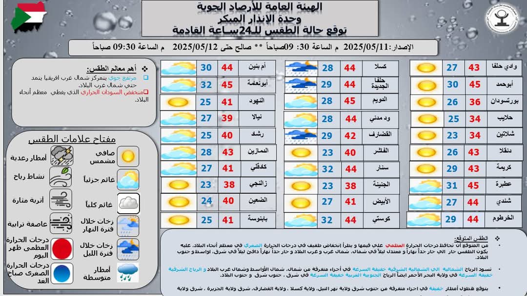 SUDA أعلى درجة حرارة متوقعة ظهر اليوم 45.0 م في كل من عطبرة، الدويم و أبي نعامة وأدني درجة حرارة متوقعة صباح الغد 23.0 م في مدينتي الجنينة زالنجي.