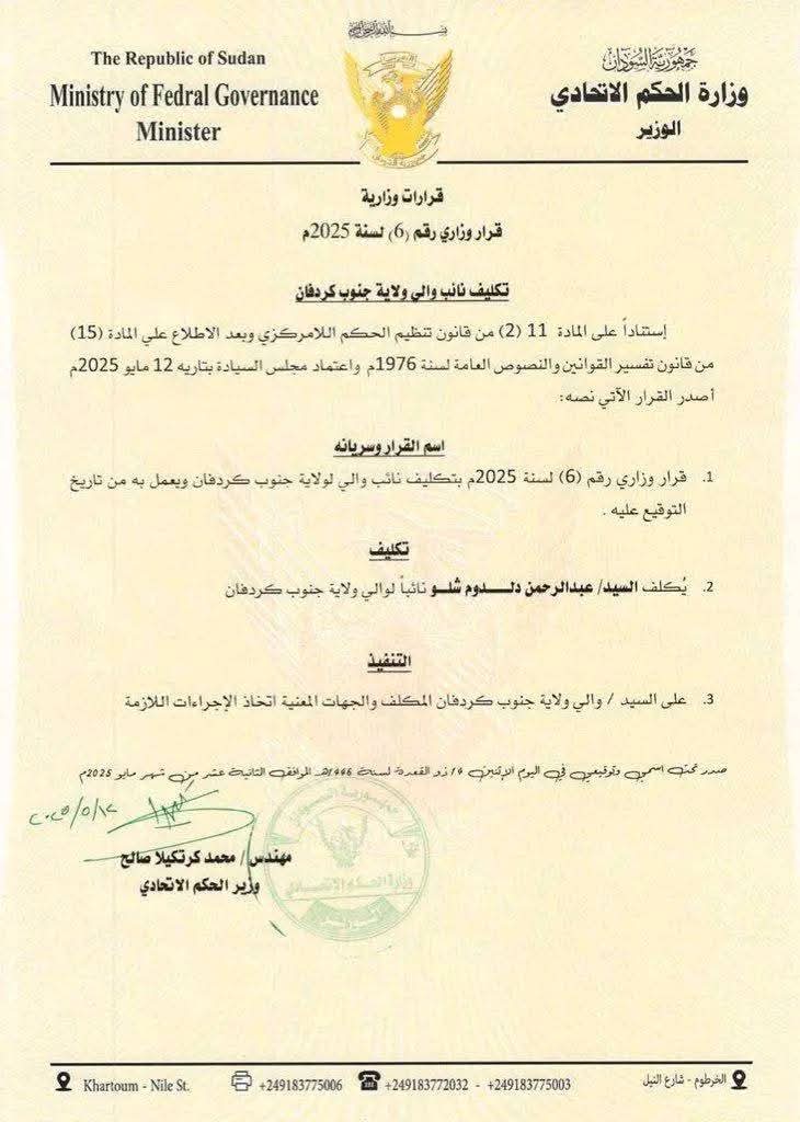 الحركة الشعبية ترحب بتكليف دلدوم نائباً لحاكم جنوب كردفان وتعتبره خطوة نحو السلام والتنمية