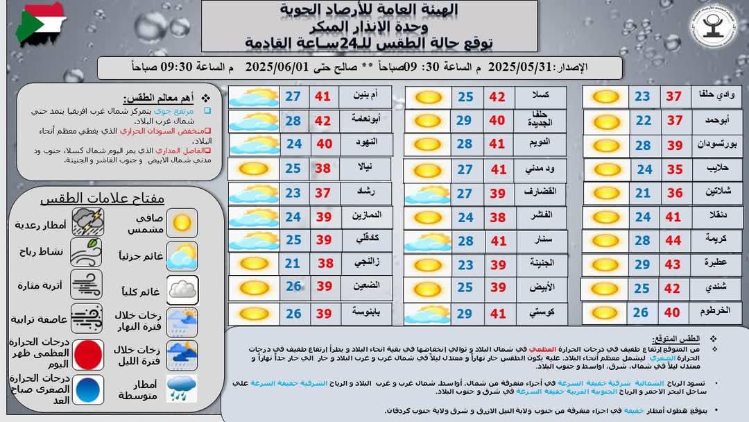 نهاراً:حار في شمال غرب وغرب البلادحار إلى حار جداً في شمال، شرق، أواسط وجنوب البلاد