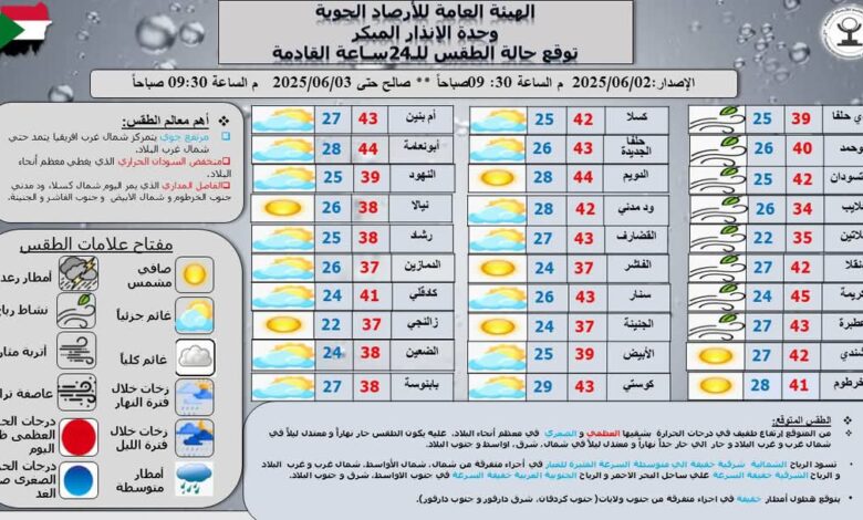 توقعت الهيئة العامة للأرصاد الجوية ارتفاع طفيف في درجات الحرارة بشقيها العظمي والصغري في معظم أنحاء البلاد، عليه يكون الطقس حار نهاراً و معتدل ليلا في شمال غرب و غرب البلاد وحار الي حار جداً نهاراً و معتدل ليلاً في شمال شرق اواسط و جنوب البلاد.