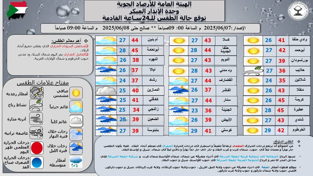 أعلى درجة حرارة متوقعة اليوم: 45.0°C في كريمة، عطبرة، أبي نعامةأدنى درجة حرارة صباح الغد: 24.0°C في شلاتين ورشاد