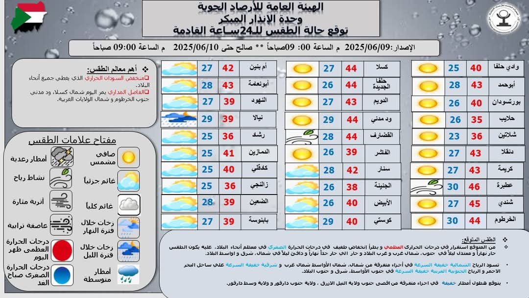 توقعت الهيئة العامة للأرصاد الجوية استقرار في درجات الحرارى العظمي و يطرأ انخفاض طفيف في درجات الحرارة الصغري في معظم أنحاء البلاد، عليه يكون الطقس حار نهاراً و معتدل ليلاً في جنوب، شمال غرب و غرب البلاد و حار الي حار جداً نهاراً و دافئ ليلا في شمال شرق و اواسط البلاد