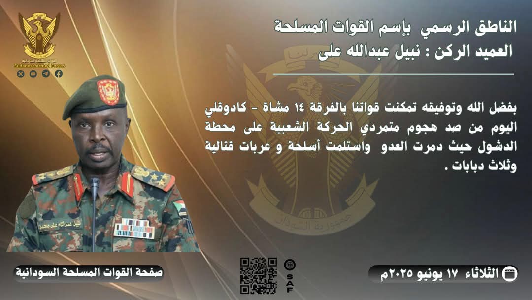 وقال الناطق الرسمي “بفضل الله وتوفيقه تمكنت قواتنا بالفرقة ١٤ مشاة – كادوقلي اليوم من صد هجوم متمردي الحركة الشعبية على محطة الدشول حيث دمرت العدو واستلمت أسلحة وعربات قتالية و ثلاث دبابات – الثلاثاء ١٧ يونيو ٢٠٢٥ “.