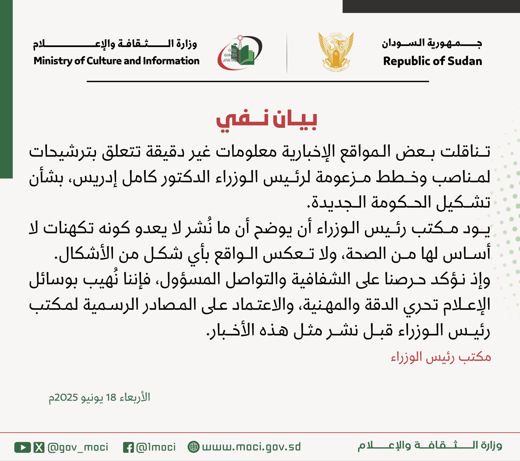 تناقلت بعض المواقع الإخبارية معلومات غير دقيقة تتعلق بترشيحات لمناصب وخطط مزعومة لرئيس الوزراء الدكتور كامل إدريس، بشأن تشكيل الحكومة الجديدة.