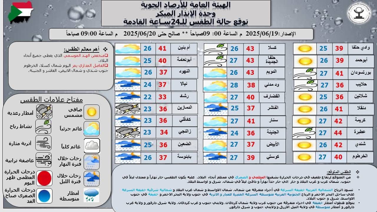 درجات الحرارة المتوقعة: الأعلى ظهر اليوم: 44.0°C في عطبرة الأدنى صباح الغد: 22.0°C في رشاد