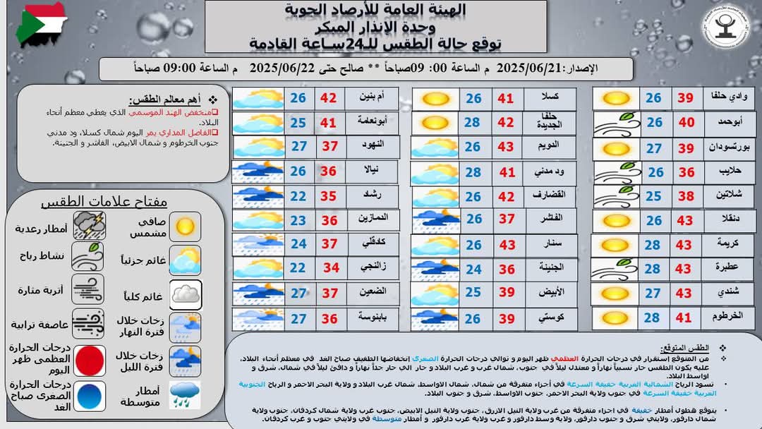 درجات الحرارة المتوقعة: الأعلى ظهر اليوم: 43.0°C في دنقلا، كريمة، عطبرة، شندي، الدويم، سنارالأدنى صباح الغد: 22.0°C في رشاد، زالنجي