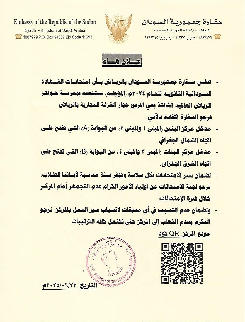 وقالت السفارة في بيان لها تحصلت سونا نسخة منه ستعقد الامتحانات في الوقت المحدد لها يوم ٢٩من هذا الشهر وستقام في مدرسة جواهر الرياض العالمية الثالثة بحي المربع جوار الغرفة التجارية البنين والمبنى ٢ والبنات المبنى ٣و٤وذللك لضمان سير الامتحانات بكل سلاسة وتوفر بنية مناسبة للطلاب