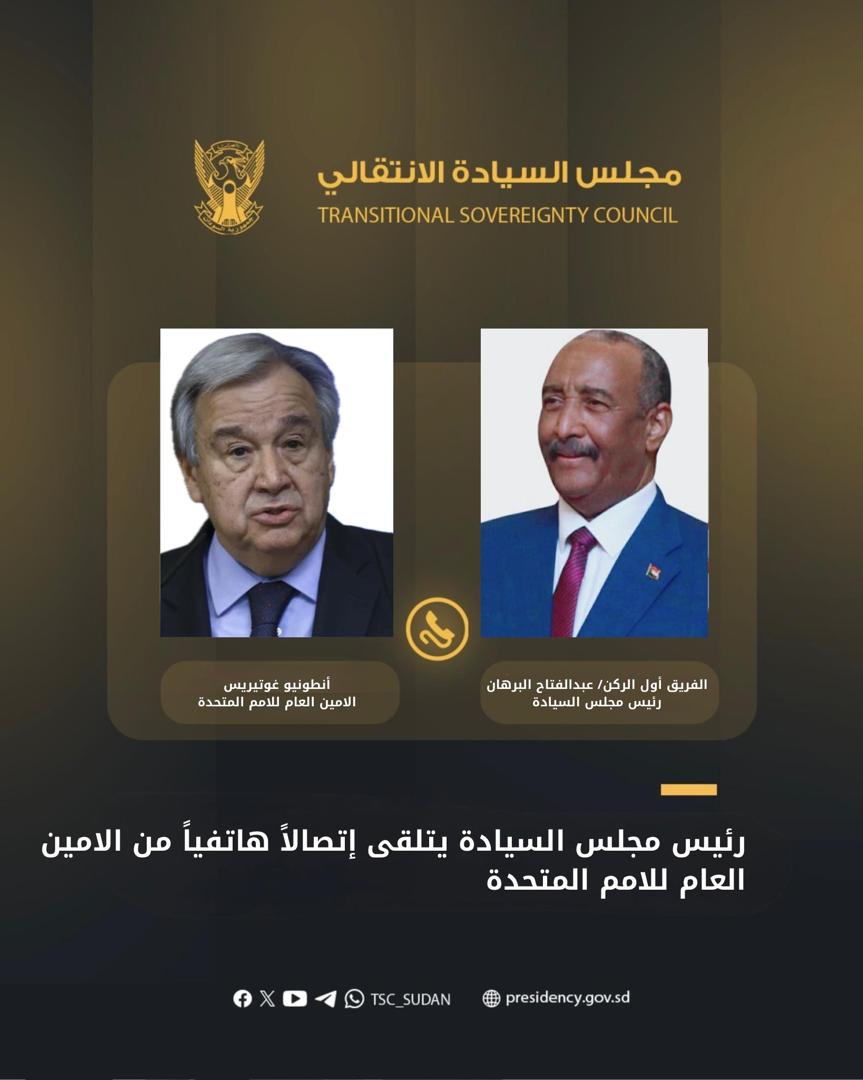 تلقى رئيس مجلس السيادة الانتقالي الفريق أول الركن *عبدالفتاح البرهان* إتصالاً هاتفياً من الأمين العام للأمم المتحدة، *أنطونيو غوتيريش*، عبر فيه عن ترحيبه بتعيين الدكتور *كامل إدريس رئيساً للوزراء* .