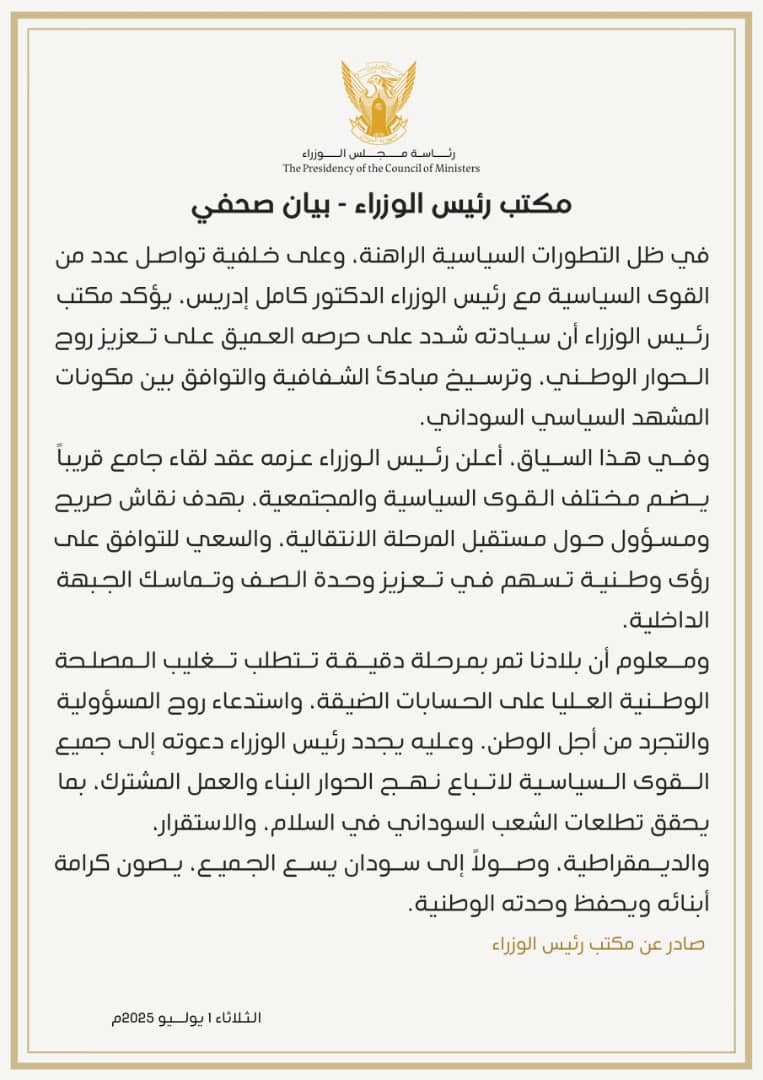 أعلن مكتب رئيس الوزراء د. كامل إدريس عزمه عقد لقاء جامع بالقوى السياسية والمجتمعية قريبا للتفاكر حول مستقبل المرحلة الانتقالية