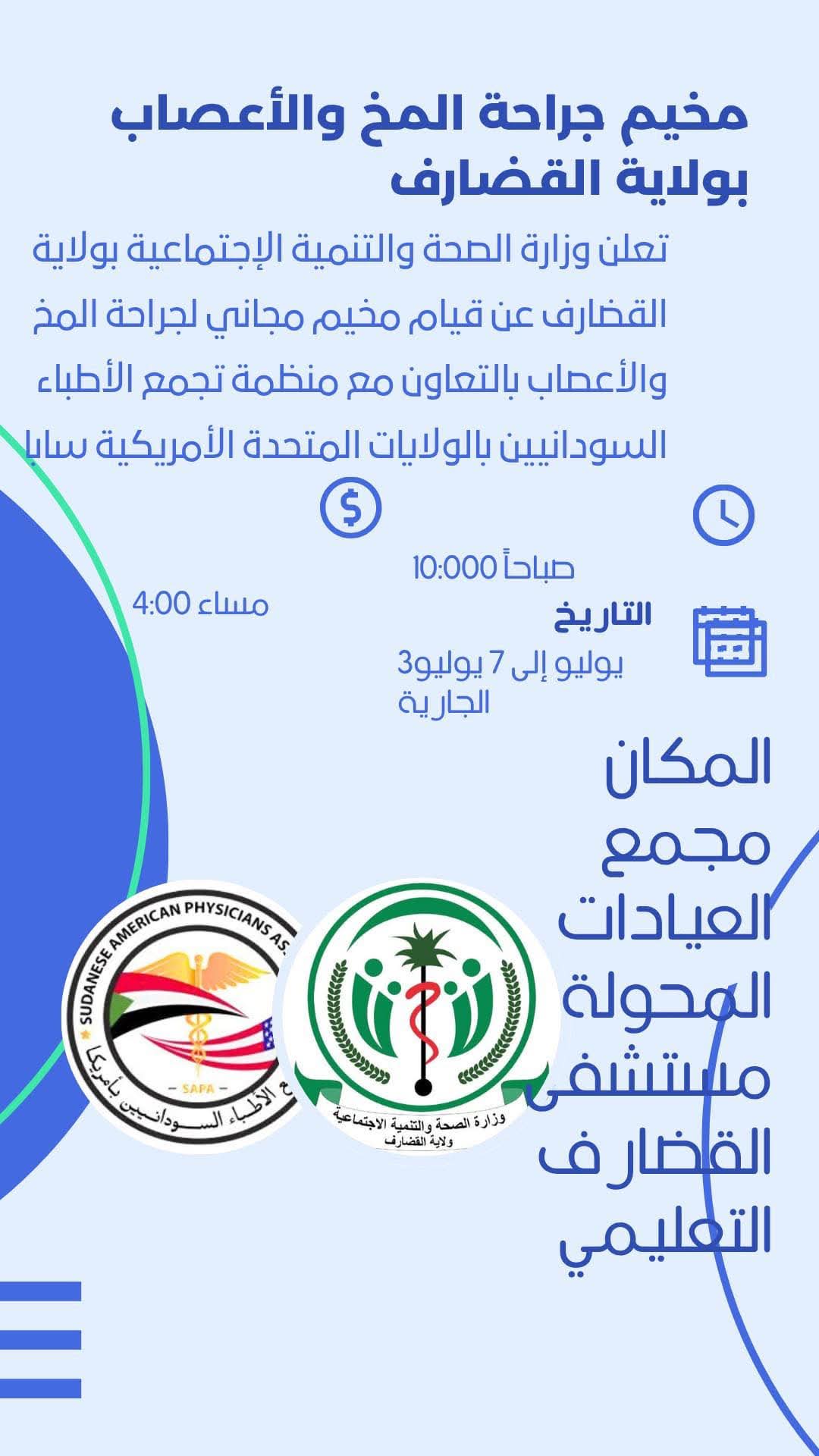 أعلنت وزارة الصحة والتنمية الاجتماعية بولاية القضارف عن انطلاق مخيم جراحة المخ والأعصاب اليوم الخميس الموافق 3 يوليو، ويستمر حتى السابع من الشهر الجاري، وذلك بالتعاون مع منظمة تجمع الأطباء السودانيين بالولايات المتحدة الأمريكية (سابا).