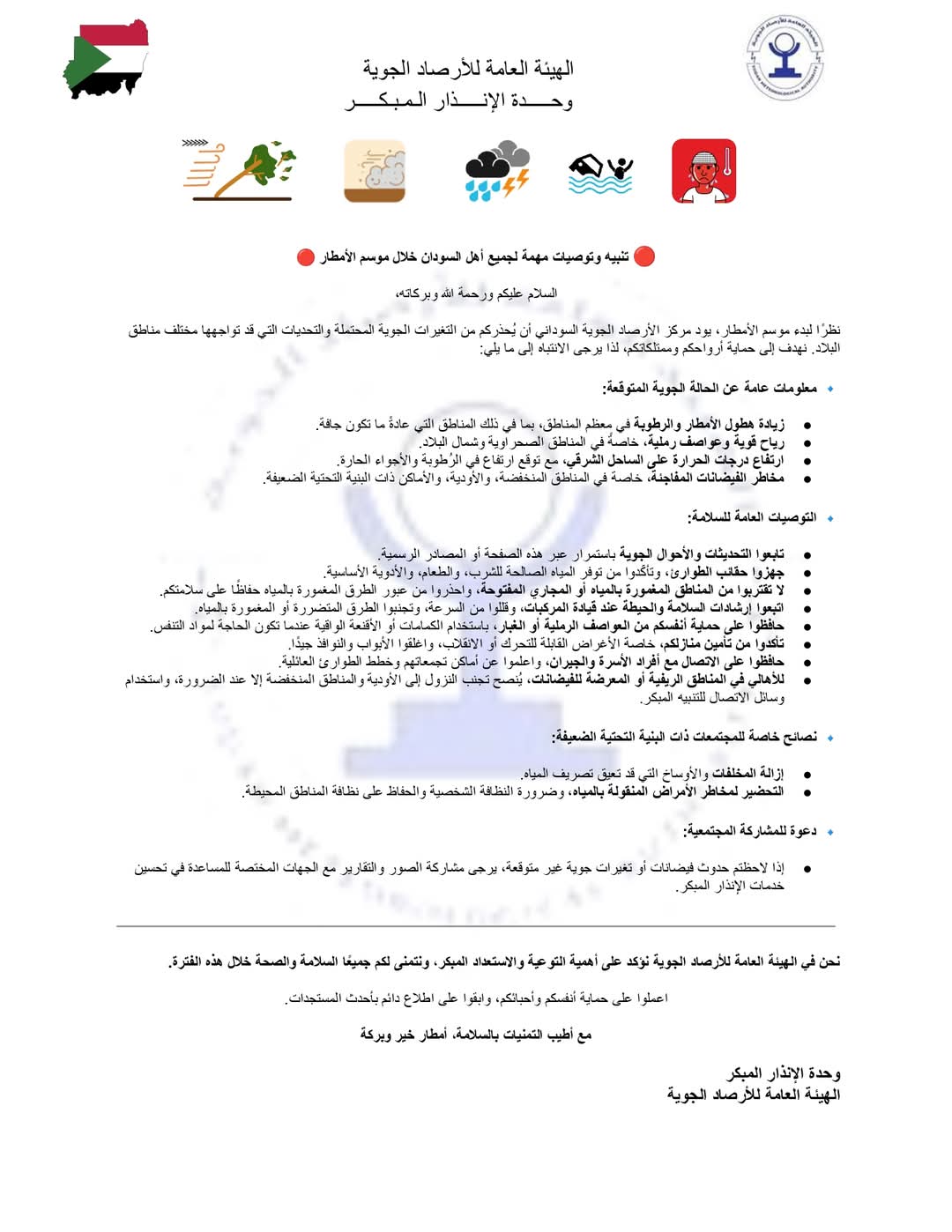نظرًا لبدء موسم الأمطار، يود مركز الأرصاد الجوية السوداني أن يُحذركم من التغيرات الجوية المحتملة والتحديات التي قد تواجهها مختلف مناطق البلاد. نهدف إلى حماية أرواحكم وممتلكاتكم، لذا يرجى الانتباه إلى ما يلي: