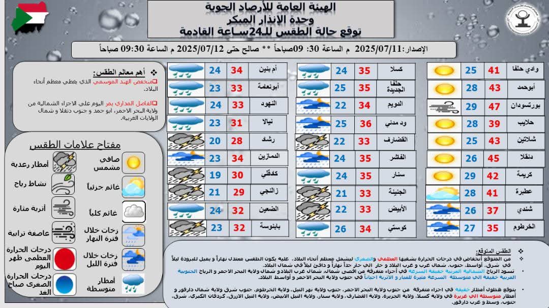 يتوقع هطول أمطار خفيفة في اجزاء متفرقة من جنوب ولاية البحر الاحمر جنوب ولاية نهر النيل، ولاية الخرطوم، جنوب شرق ولاية شمال دارفور وأمطار متوسطة إلى غزيرة في ولاية كسلا، ولاية الجزيرة، ولاية القضارف، ولاية سنار ولاية النيل الابيض ولاية النيل الازرق كردفان الكبري شرق جنوب وسط و غرب دارفور.