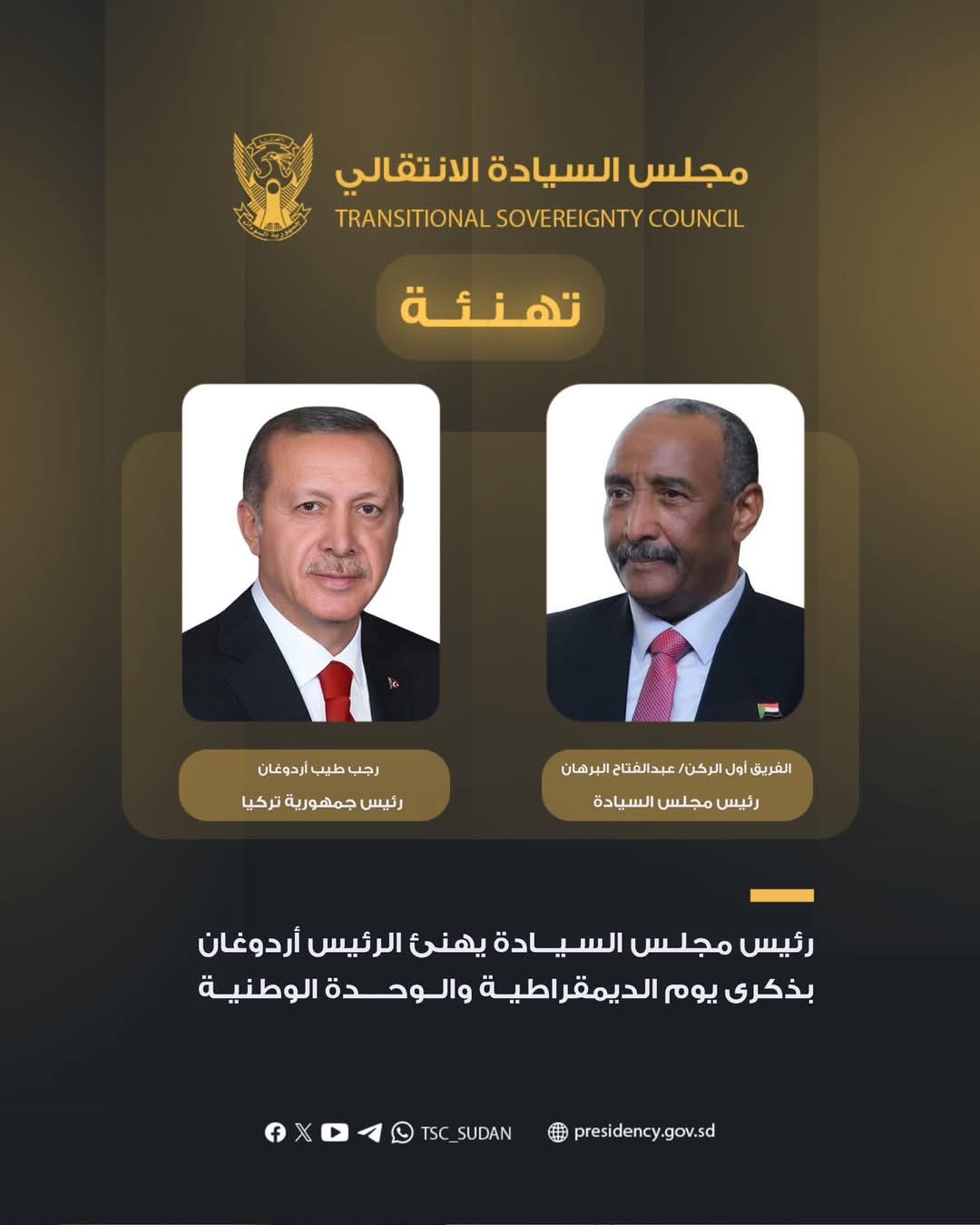 بعث السيد رئيس مجلس السيادة الانتقالي القائد العام للقوات المسلحة الفريق أول الركن *عبدالفتاح البرهان* ،برقية تهنئة إلى فخامة الرئيس رجب طيب أردوغان رئيس الجمهورية التركية الشقيقة، بمناسبة “يوم الديمقراطية والوحدة الوطنية”.